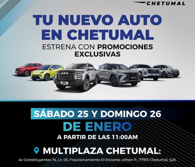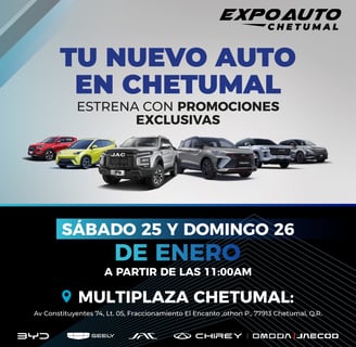 Este próximo sábado 25 y domingo 26 de enero, Chetumal se convertirá en el epicentro de la innovación automotriz con la ExpoAuto 2025. Si eres amante de los autos o simplemente te interesa conocer las últimas tendencias del sector, este es un evento que no puedes dejar pasar.