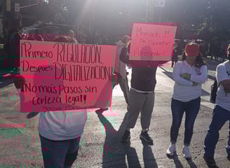 Los manifestantes portaban pancartas y coreaban consignas en contra del gobierno de la Ciudad de México, exigiendo un diálogo inmediato con las autoridades para frenar la implementación del nuevo sistema.