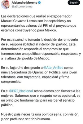 El exgobernador de Tamaulipas, Manuel Cavazos Lerma, fue destituido como secretario de Operación Política del PRI luego de emitir comentarios misóginos sobre la hermana de Cuauhtémoc Blanco. La decisión fue tomada por Alejandro Moreno, líder del partido, en un intento de reforzar el compromiso del PRI con el respeto y la equidad de género.