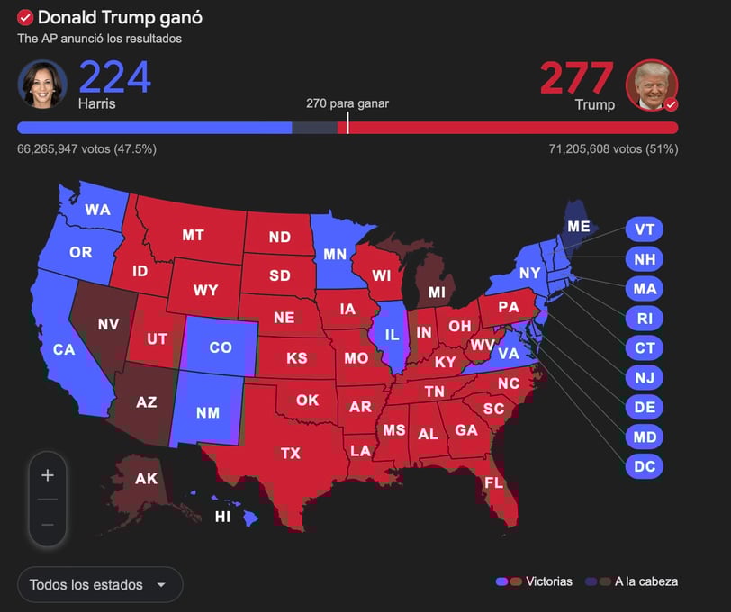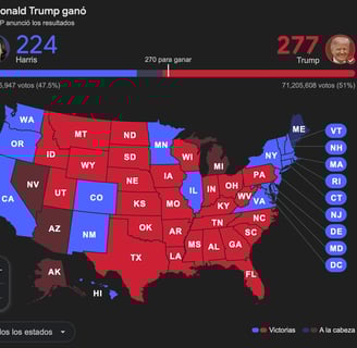 En las elecciones presidenciales de Estados Unidos en 2024, Donald Trump fue elegido nuevamente como presidente tras vencer a la candidata demócrata Kamala Harris. Esta victoria marca el regreso de Trump a la Casa Blanca y significa un cambio en la política del país después del gobierno de Joe Biden. Los republicanos también lograron una mayoría en el Senado y reforzaron su posición en la Cámara de Representantes, lo que les permitirá avanzar en la agenda legislativa del nuevo presidente y confirmar nominaciones clave para su gabinete y el sistema judicial (El País, 2024; Reuters, 2024; Voz de América, 2024).