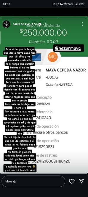 La situación escaló en enero de 2025, cuando Santa Fe Klan compartió en redes sociales que proporcionaba una pensión mensual de 250 mil pesos para la manutención de Luka, pero que enfrentaba dificultades para convivir con él. Maya Nazor respondió señalando que no impedía las visitas, pero expresó preocupaciones sobre la seguridad de su hijo, mencionando que el rapero llegaba acompañado de personas armadas y bajo la influencia de sustancias.